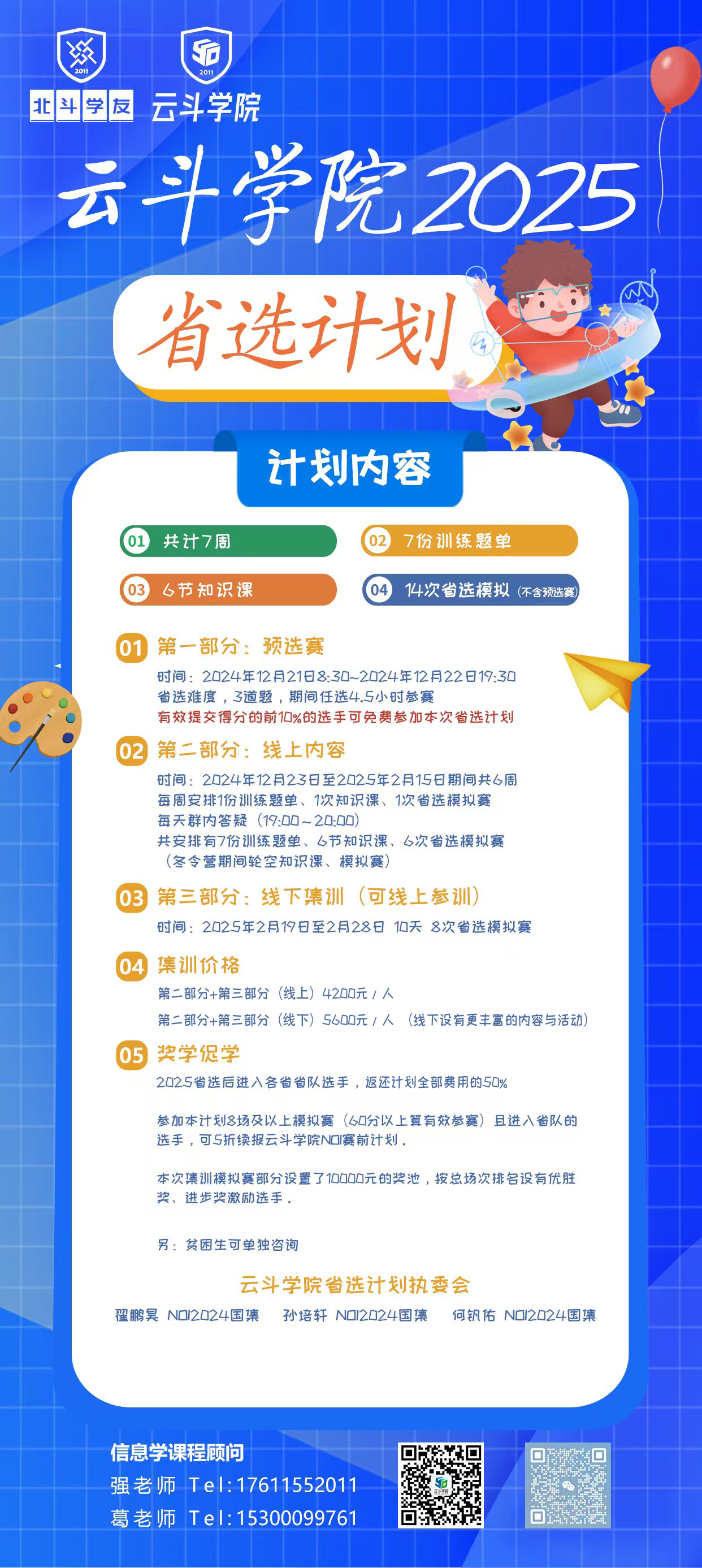 update 19:30 我们会根据有提交成绩的前10% 整理可免费参加云斗25年省选计划的选手以及GR的获奖选手的名单并进行公示,请大家持续关注本页面。